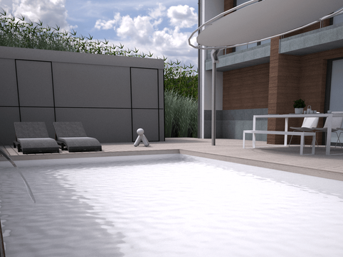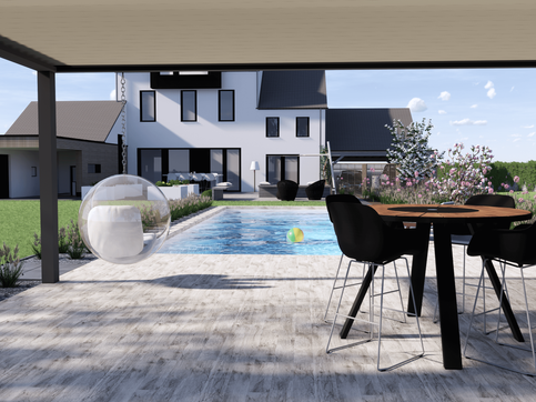 NOVA crée des prévisualisations extérieures où chaque projet est intégré dans son contexte le plus fidèlement possible. Pour ce faire un maximum d'éléments sont pris en compte, tel que la végétation, les abords, l'orientation, le mobilier, la lumière ou l'éclairage extérieur pour obtenir une image finale des plus réaliste.